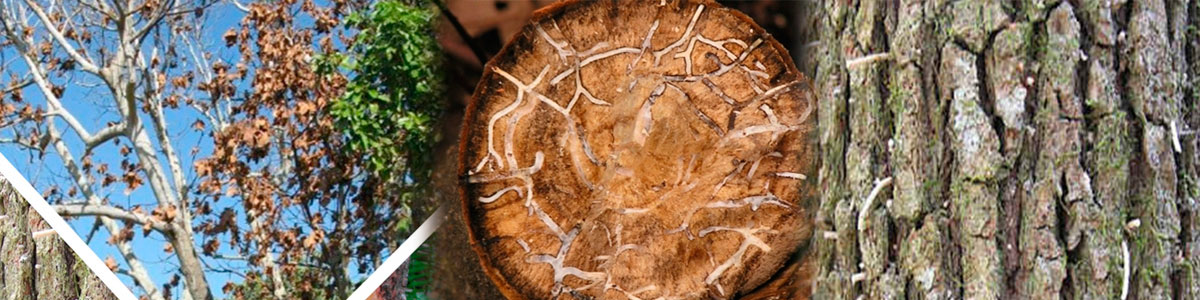 Al eliminar la corteza del tronco, se observan los puntos de entrada de los insectos y las líneas o manchas oscuras producidas por la infección del hongo. Si se realiza un corte del tronco se pueden ver las galerías que realizaron los insectos.